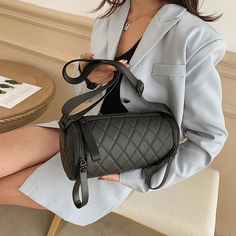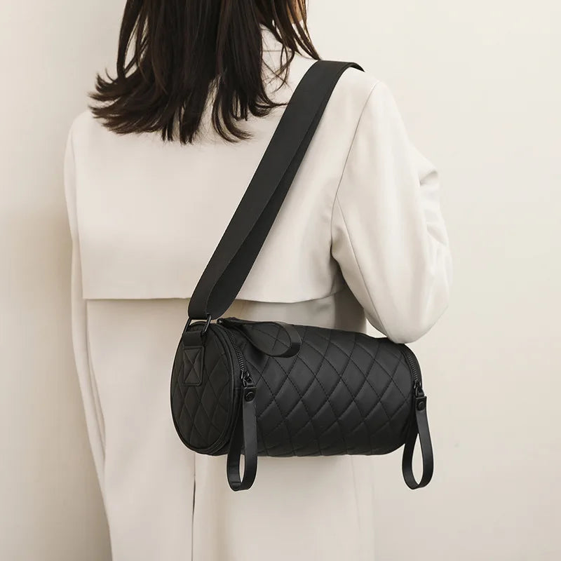 This Lingge single shoulder cylinder bag is perfect for commuting and everyday use. It features a wide shoulder belt for added comfort and style.
