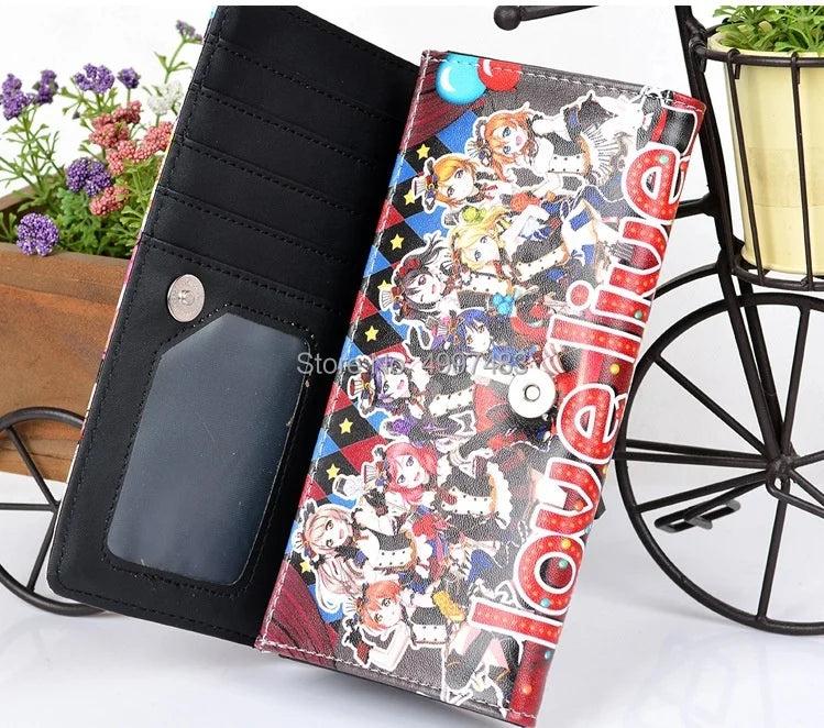A stylish and vibrant anime LoveLive women's wallet featuring colorful designs. It is a perfect accessory for any anime fan. The wallet has a button closure, making it secure for daily use.