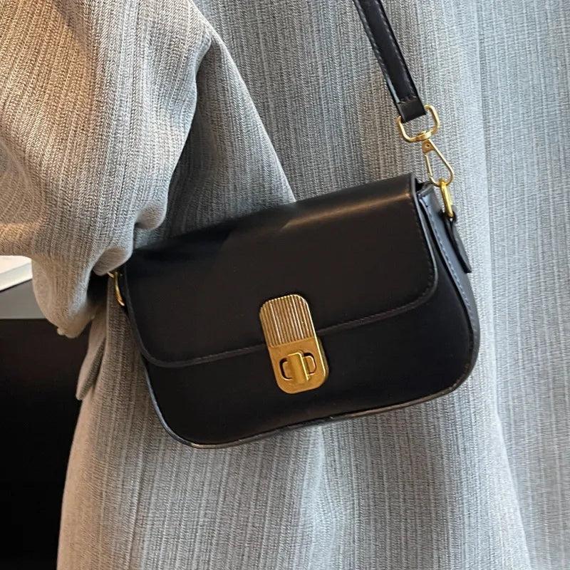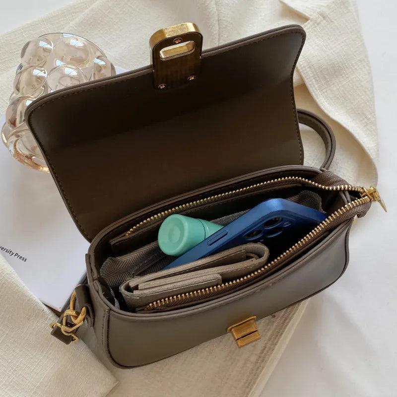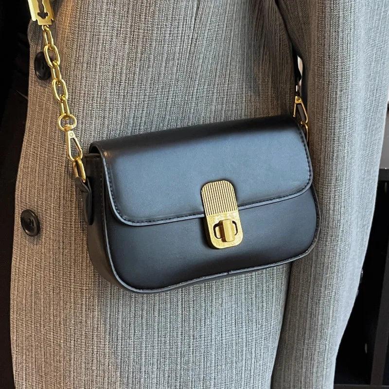 This classic small flap bag offers a stylish and versatile design. It features a unique half metal and half leather shoulder strap that adds a modern touch to any outfit.