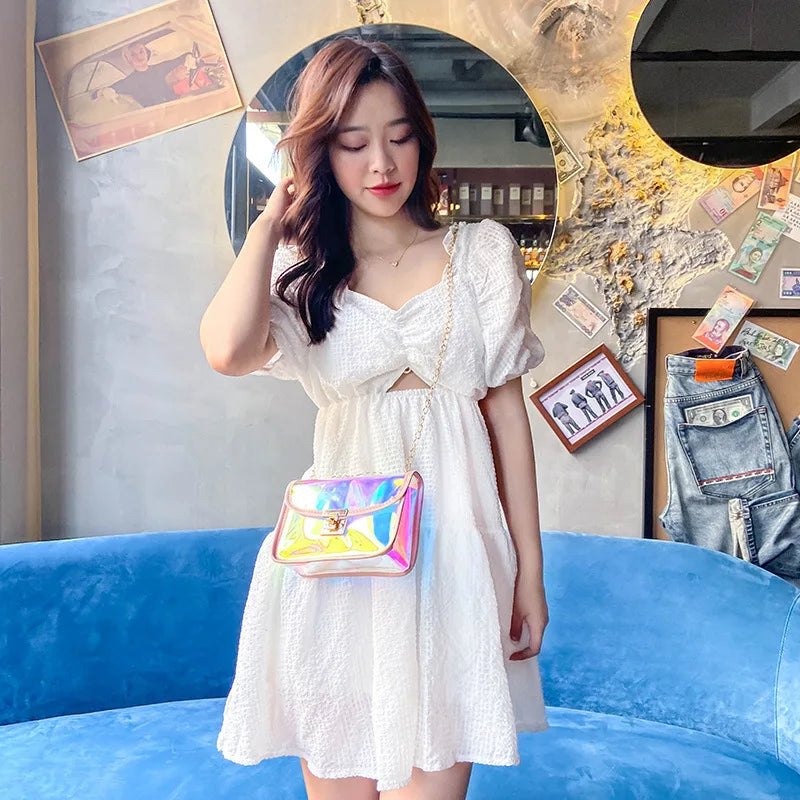 This mini laser crossbody bag is designed with PVC jelly material in candy colors. It's a small tote perfect for carrying essentials on the go.