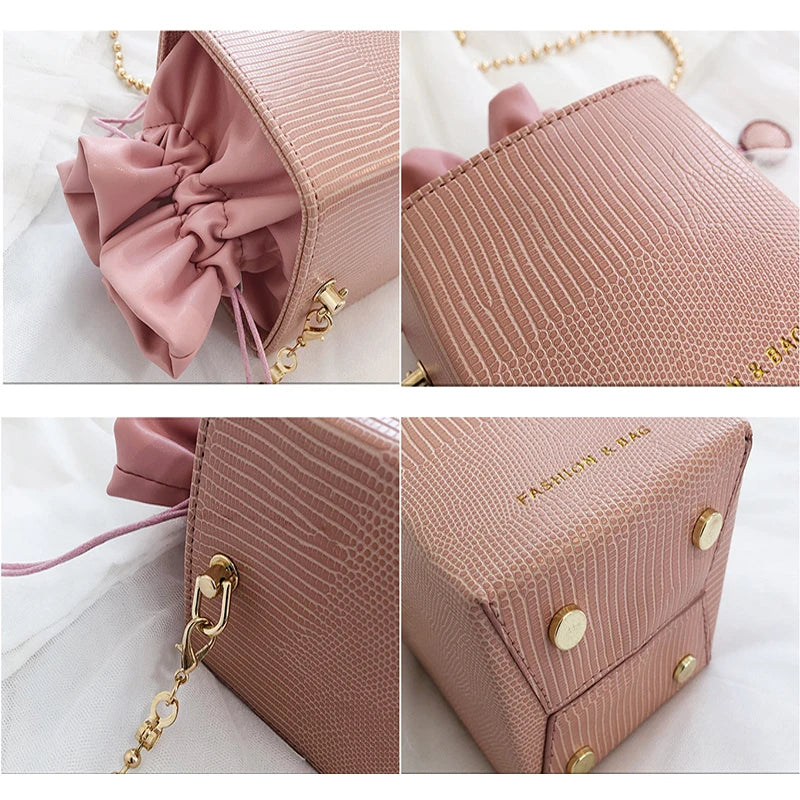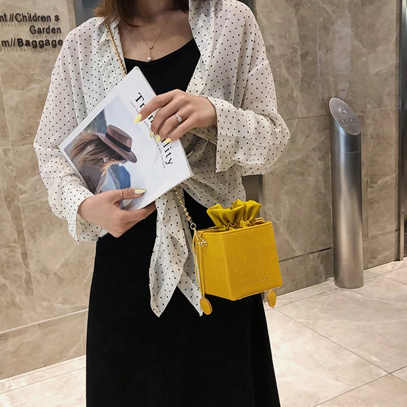This drawstring bucket bag is made of high-quality PU leather, perfect for carrying your essentials. It features a small flap design and chain strap for a stylish look.