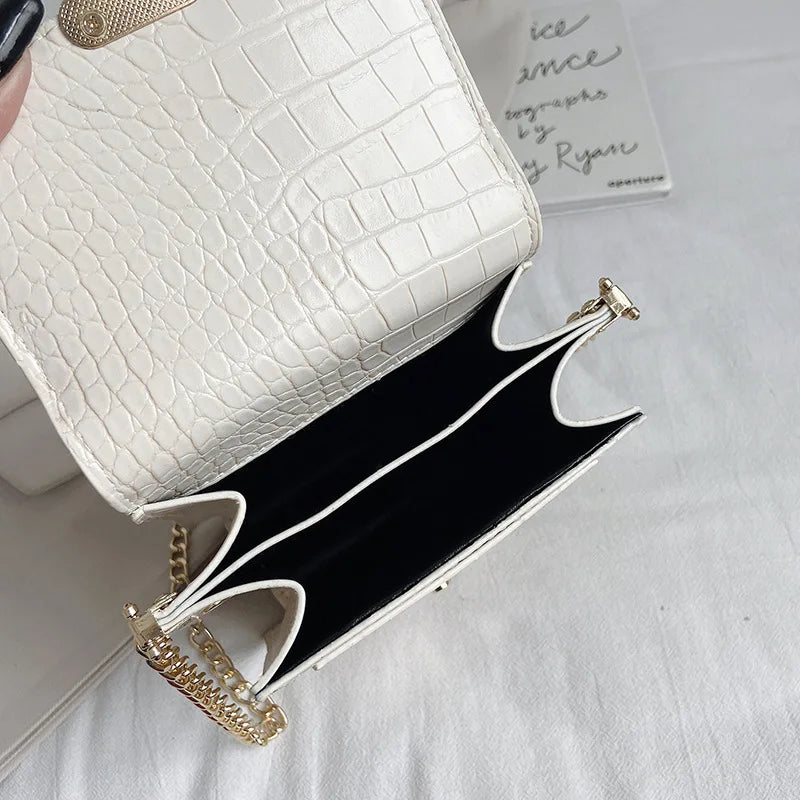 This stylish one-shoulder bag features a crocodile pattern with a secure lock and a convenient chain strap. Perfect for carrying your phone and essentials in style.