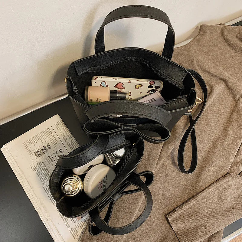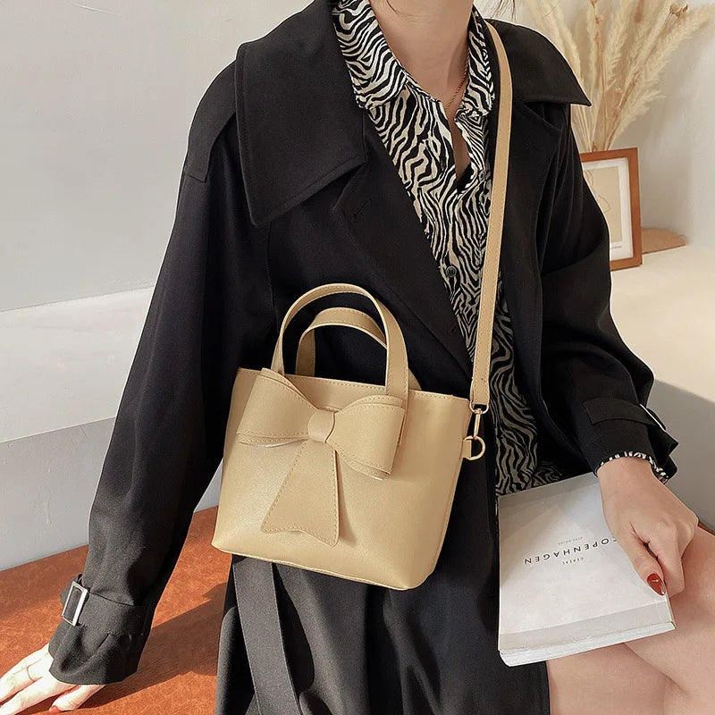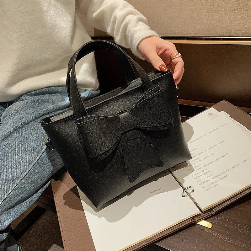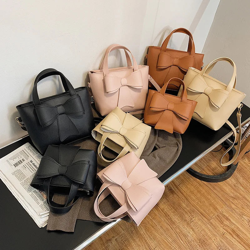 This adorable pink shoulder bag set is perfect for mother and daughter outings. Made of PU leather with a cute bow design.
