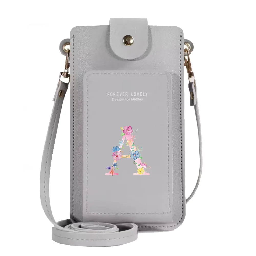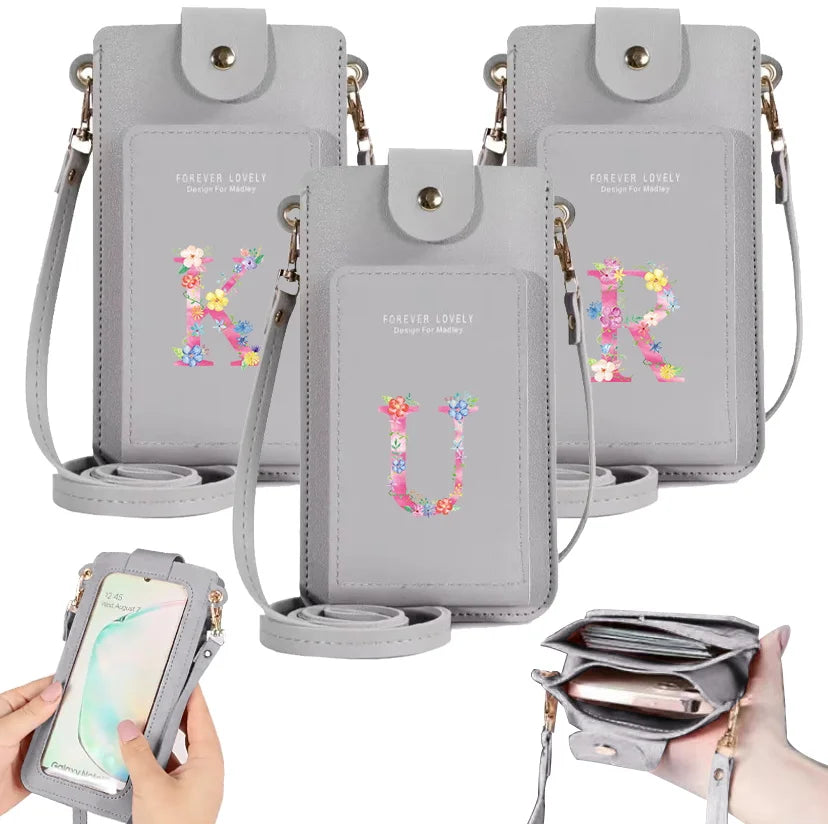This stylish crossbody bag features a pink PU leather design with a letter pattern. It has a built-in wallet, card holder, and touch screen mobile phone pocket for added convenience.