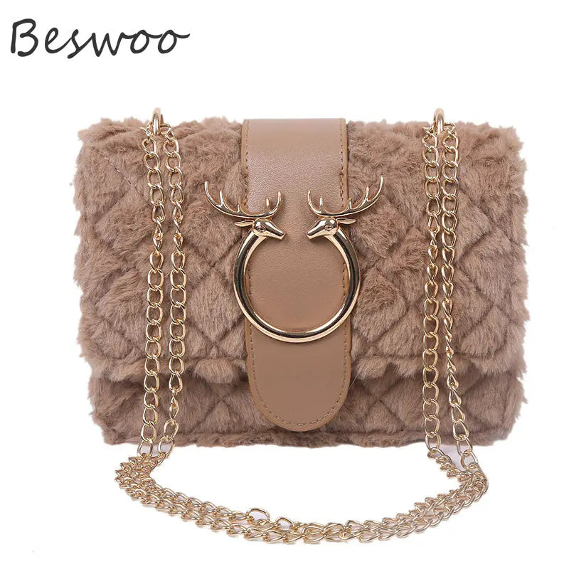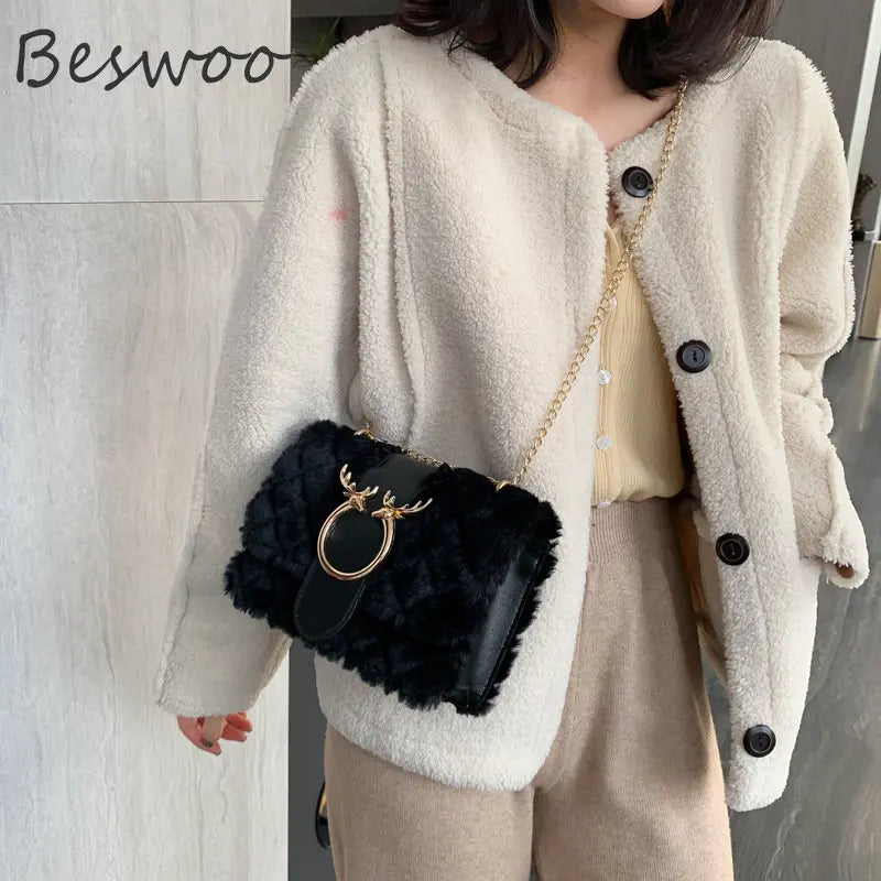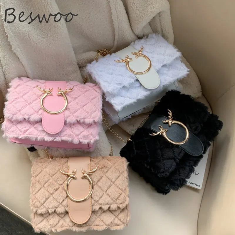 Plush Deer Crossbody Bag Chain Flap Small Square Bags for Women