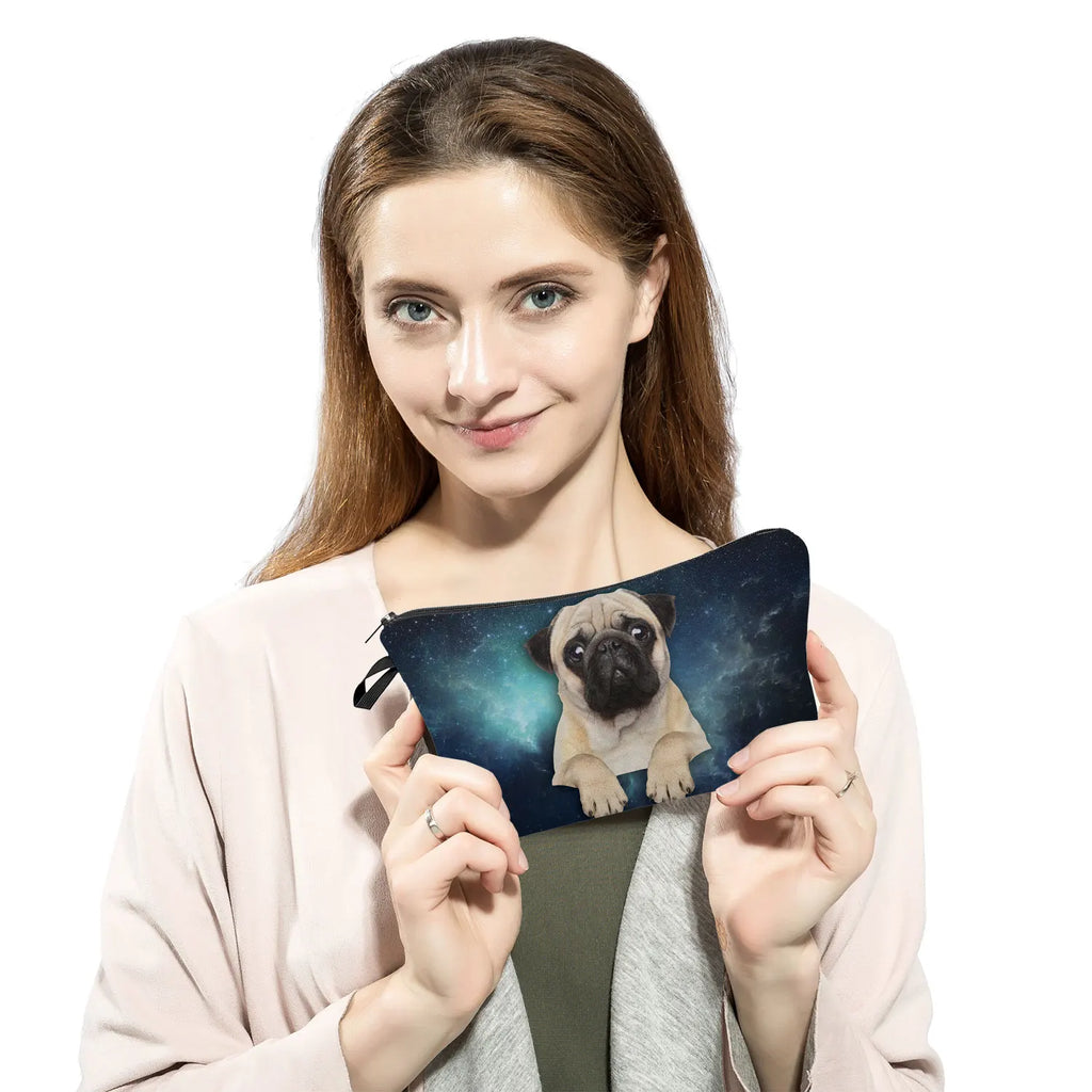 This heat transfer printed makeup bag features an adorable pug with a bow tie design. It's a great organizer for your cosmetics and a perfect gift for kids and women.