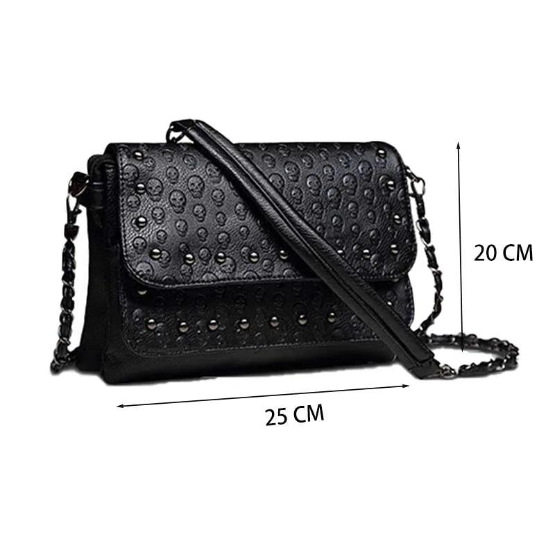 This small skull crossbody bag is designed for women who love punk style. Made of high-quality leather, it features a chain strap and satchel design.