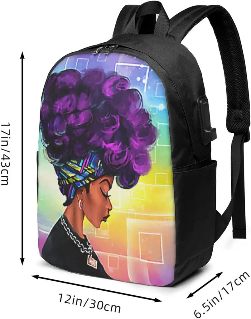 Description:Stay stylish with this African women with purple hair design laptop backpack. It is water-resistant and has a USB charging port for convenience.Features: Water-resistant laptop backpack Fits up to 17-inch laptops Unique African women with purple hair design Convenient USB charging port included Ideal for school, work, or travel This...