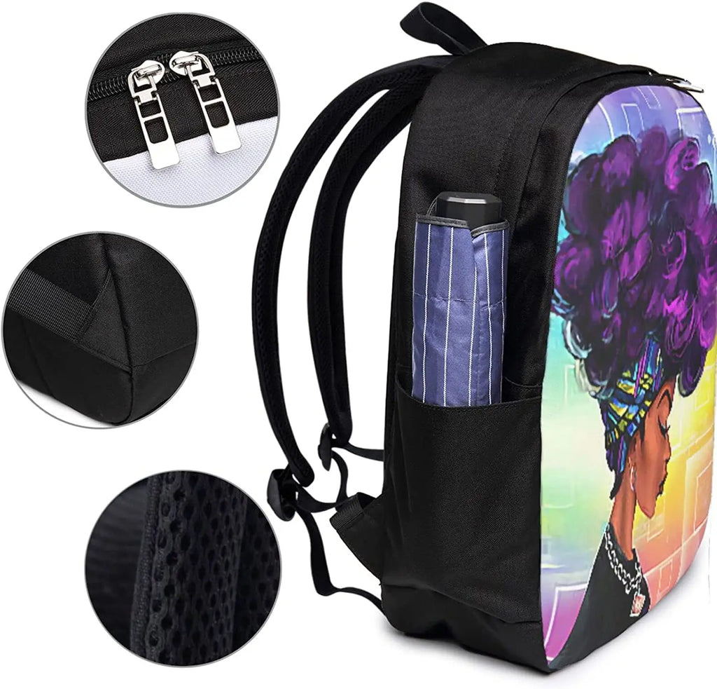 Stay stylish with this African women with purple hair design laptop backpack. It is water-resistant and has a USB charging port for convenience.
