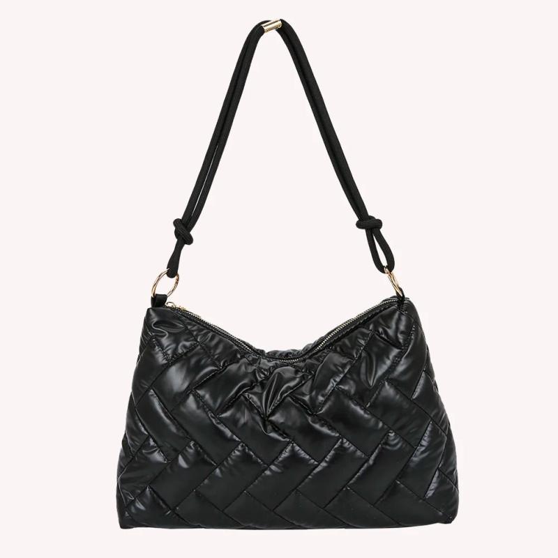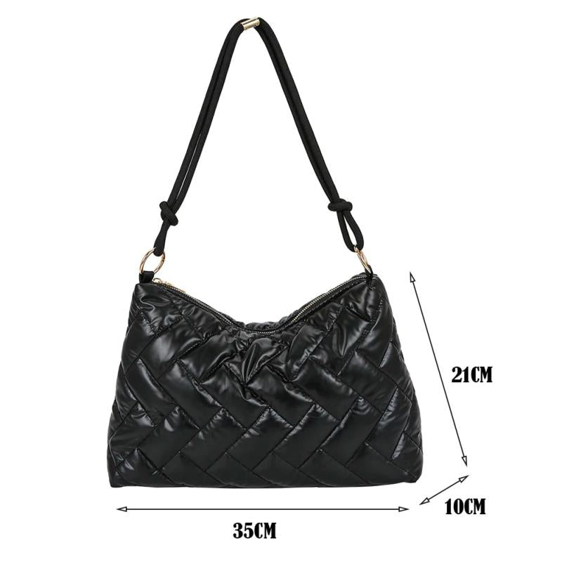 Stay stylish and warm with this quilted lattice pattern shoulder bag made of space cotton padding. Ideal for winter outings.