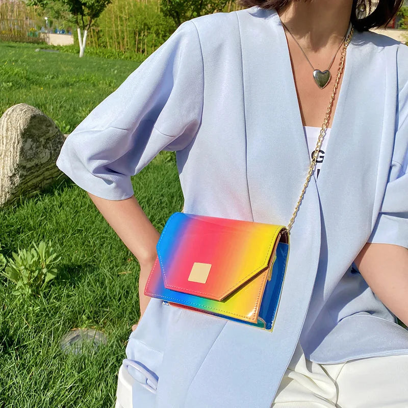 This stylish rainbow bag features a unique texture that adds a pop of color to any outfit. It is perfect for all occasions, adding a Western touch to your look.