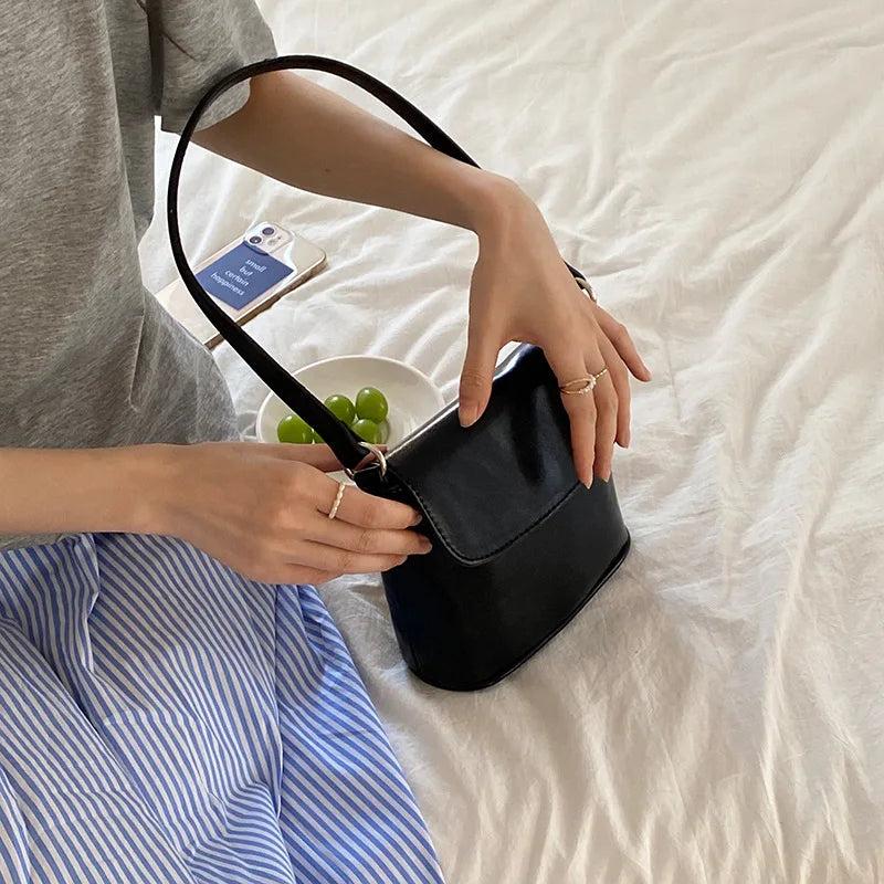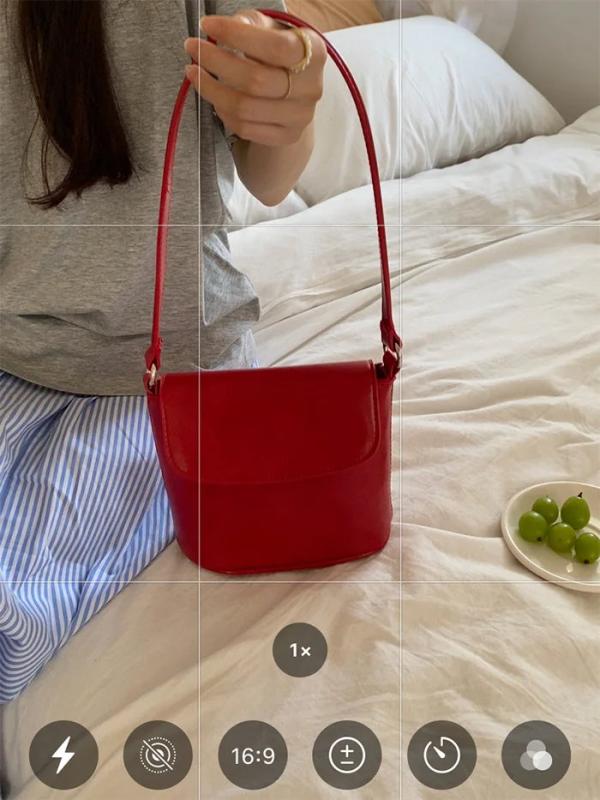 Red Leather Women Shoulder Bag Flap Cover Bucket Crossbody Bag Beige