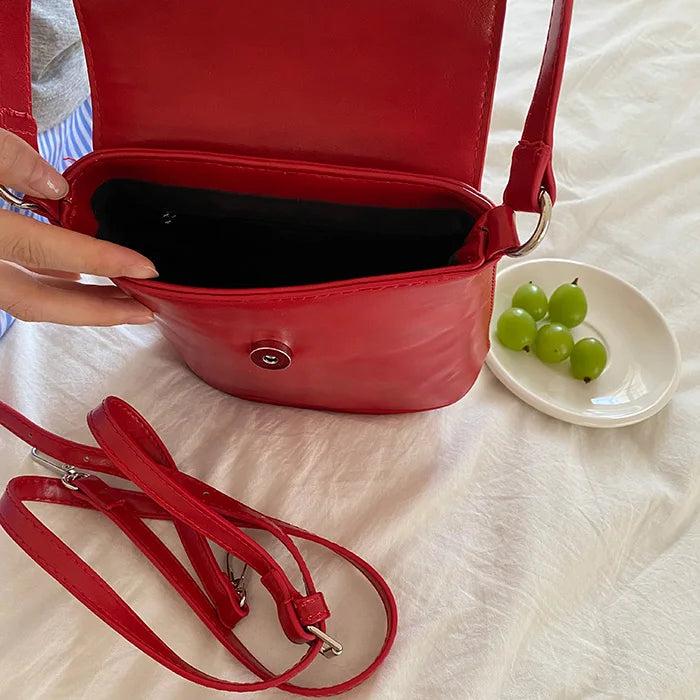 Stay fashionable and organized with this chic red leather shoulder bag featuring a flap cover design and crossbody strap. The beige interior adds a touch of elegance to your outfit.