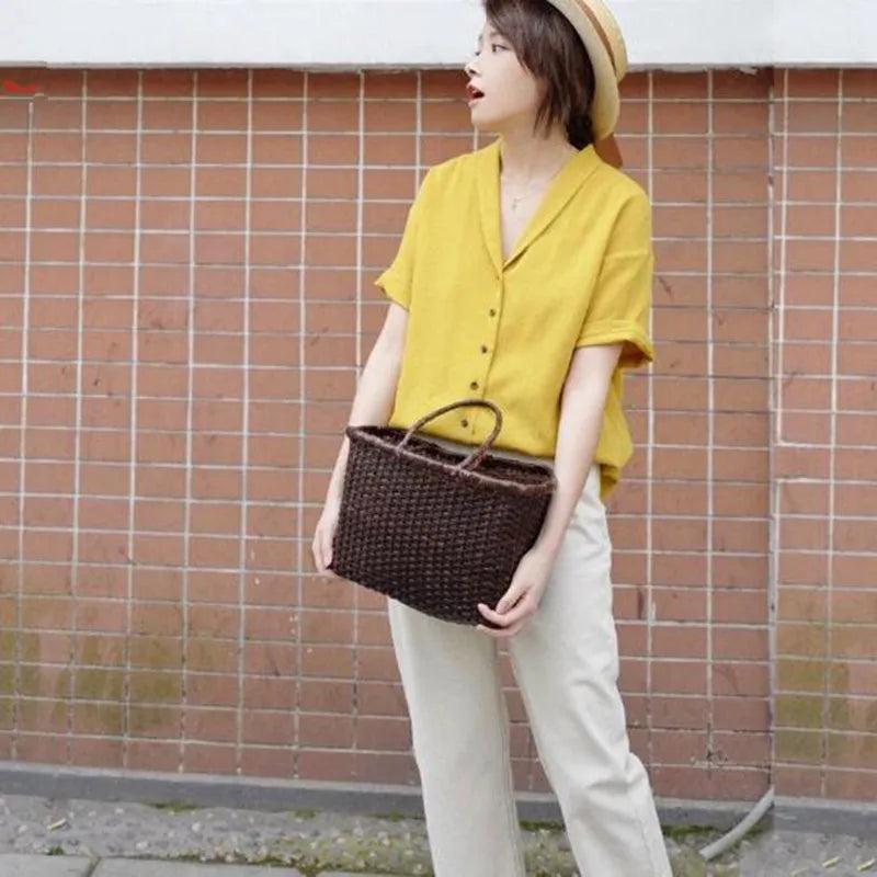 Get that vintage vibe with this retro braided leather women's shopping bag made from top-layer cowhide. Crafted from pure vegetable basket material, this bag is perfect for everyday use.