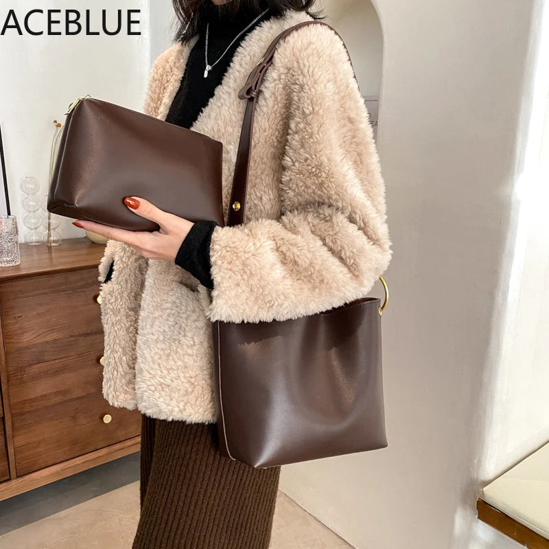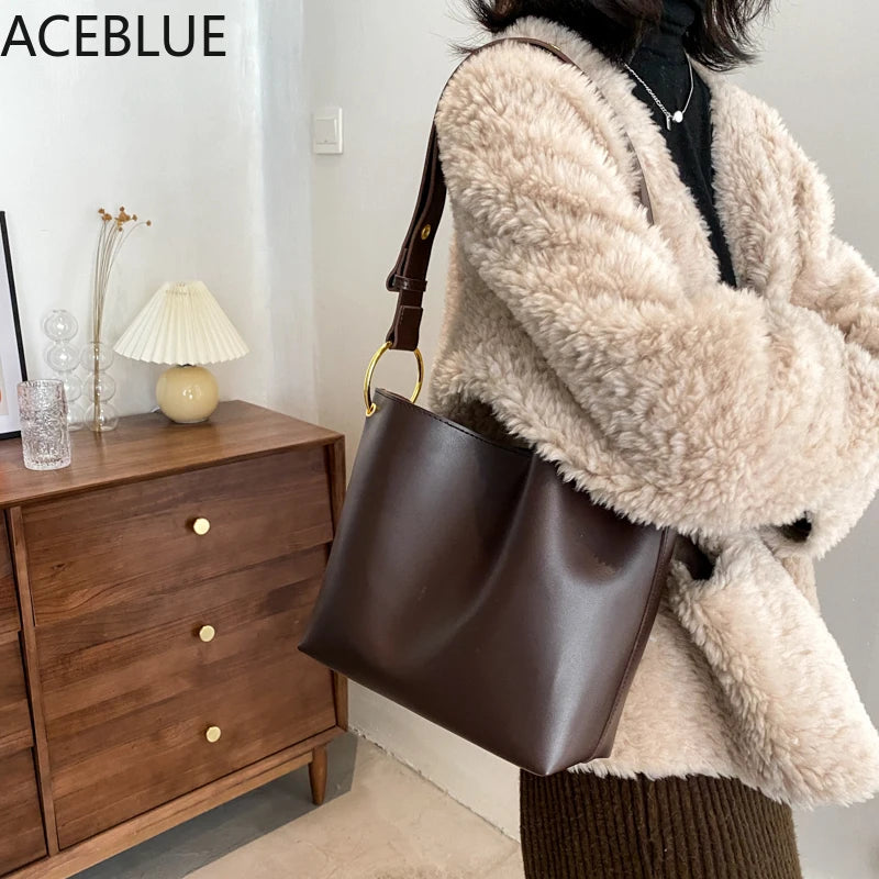 Retro Bucket Bag Solid PU Leather Crossbody Bag
