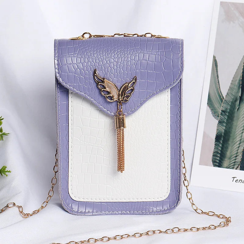 This PU bag features a retro crocodile pattern and tassel design, perfect for a mobile phone, keys, and essentials. Comes with a chain strap for a stylish look.
