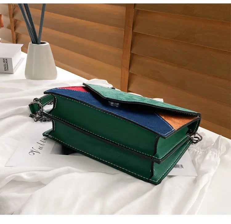 This retro crossbody bag features a patchwork design and a chain strap, perfect for daily use. The matte finish adds a touch of elegance.