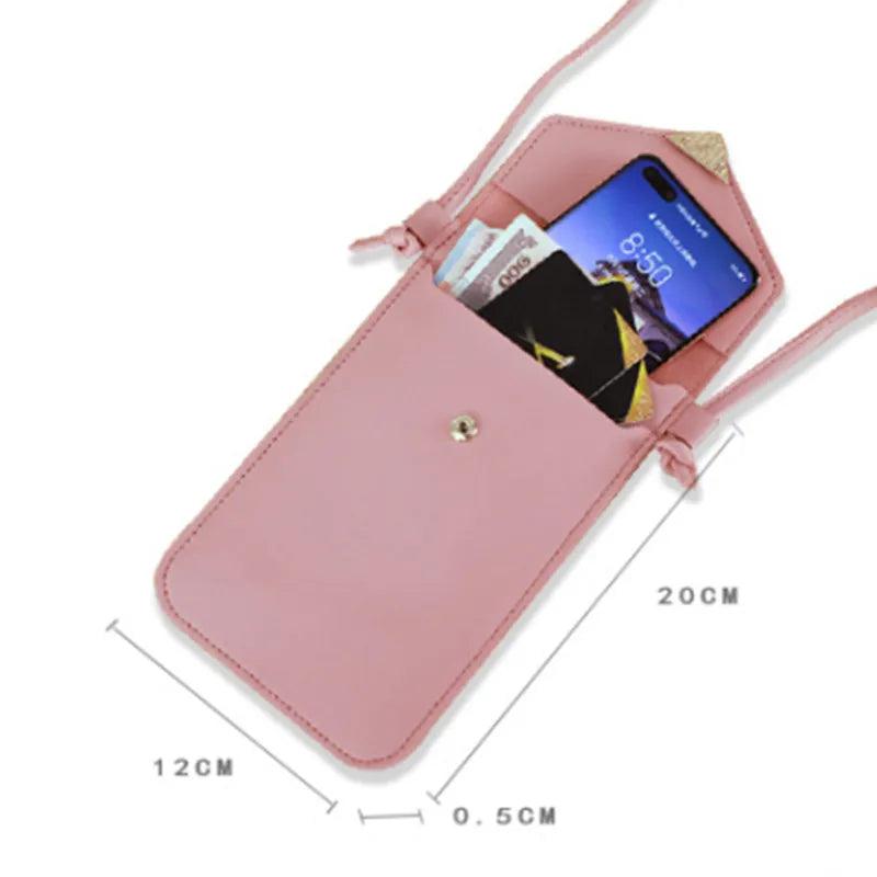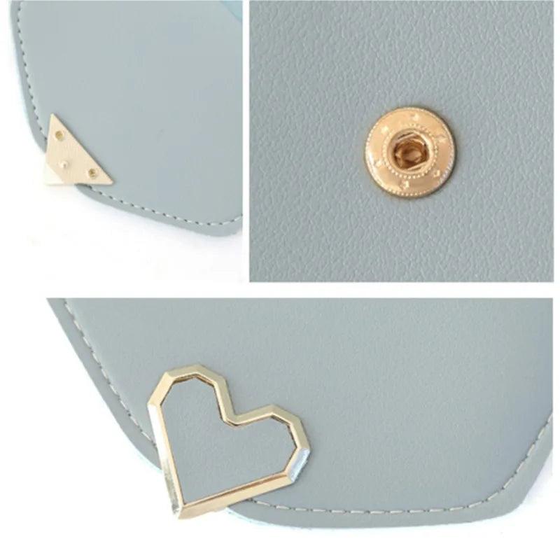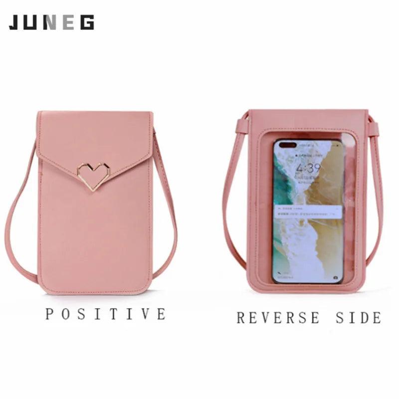 This brief retro mobile bag features a transparent touch screen, heart-shaped decoration flap, and a buckle closure. Ideal for students or daily use.