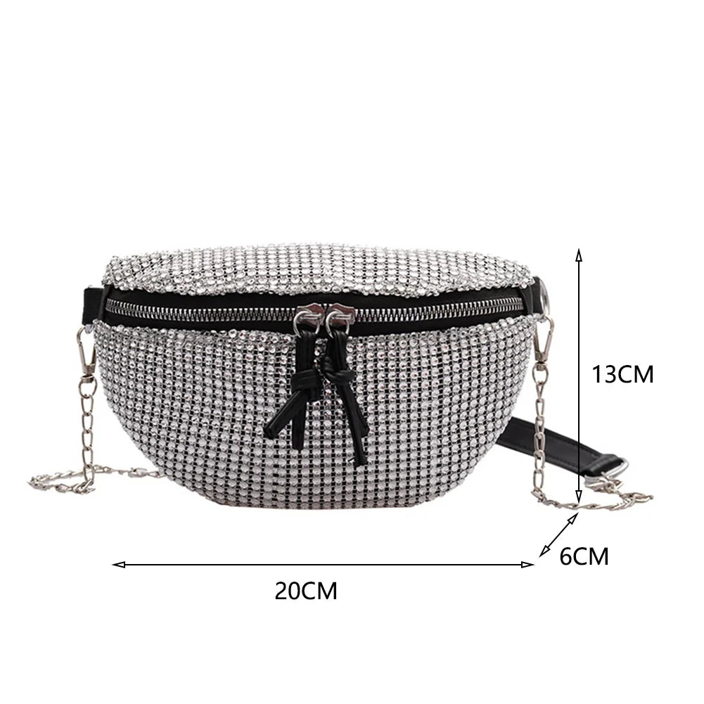This stylish waist bag features rhinestone embellishments and can be worn as a crossbody or shoulder bag. It has a secure zip closure and a convenient belt for easy carrying.