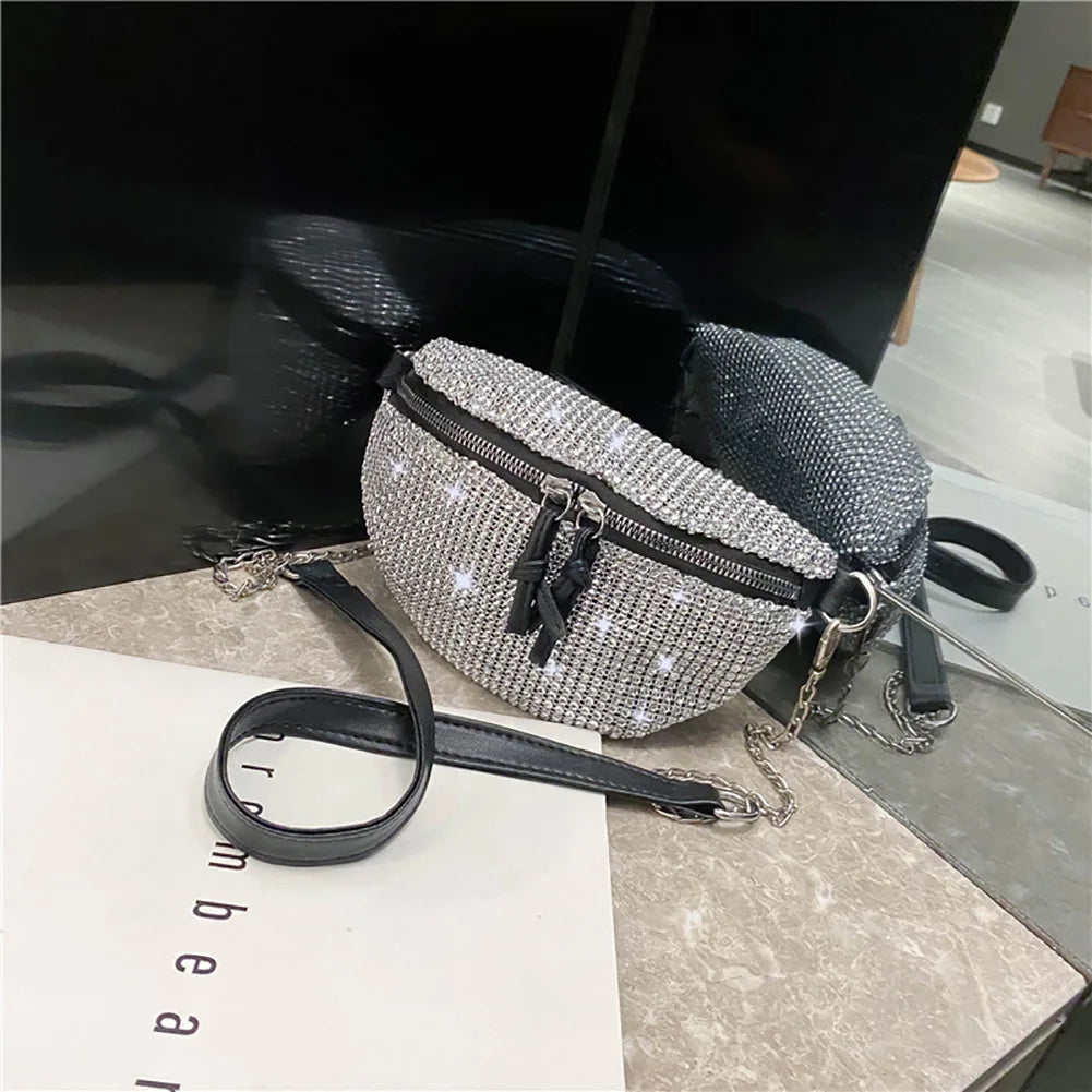 Elevate your style with this women's waist bag featuring rhinestones. Can be worn as a fanny pack or chest pack with a fashionable chain strap. Perfect for carrying your essentials in a trendy and sparkly way.