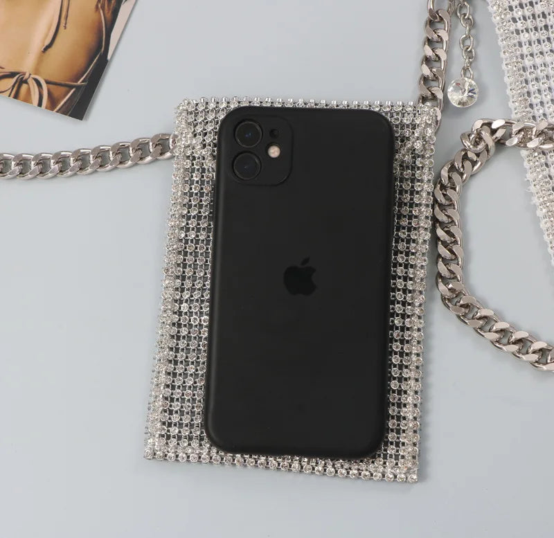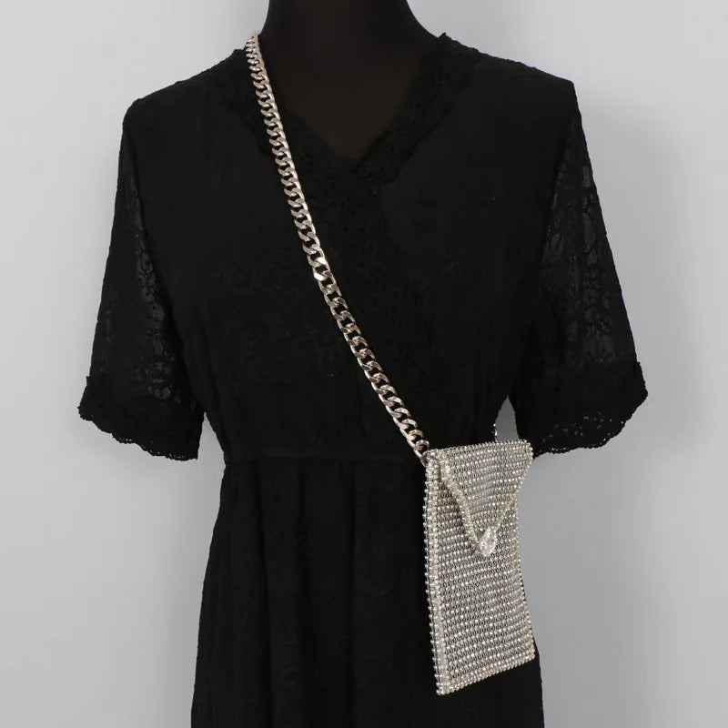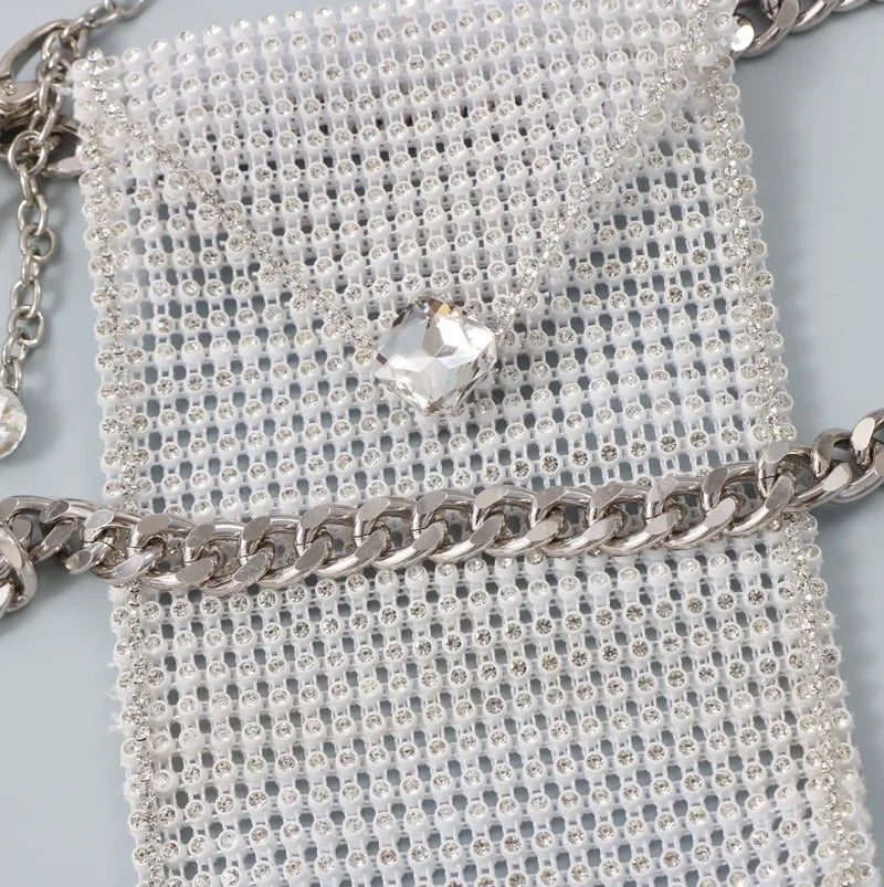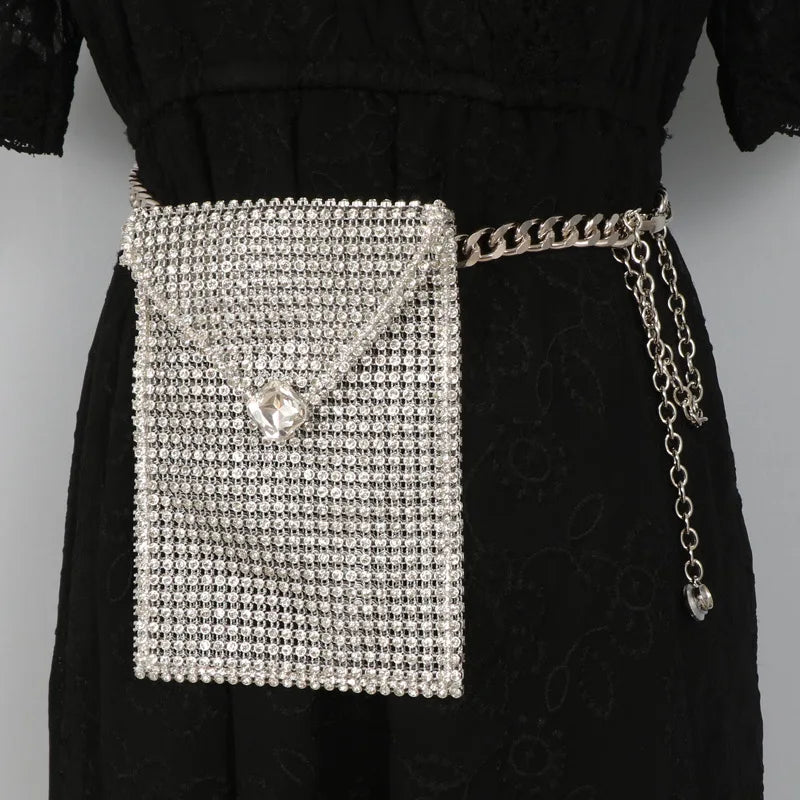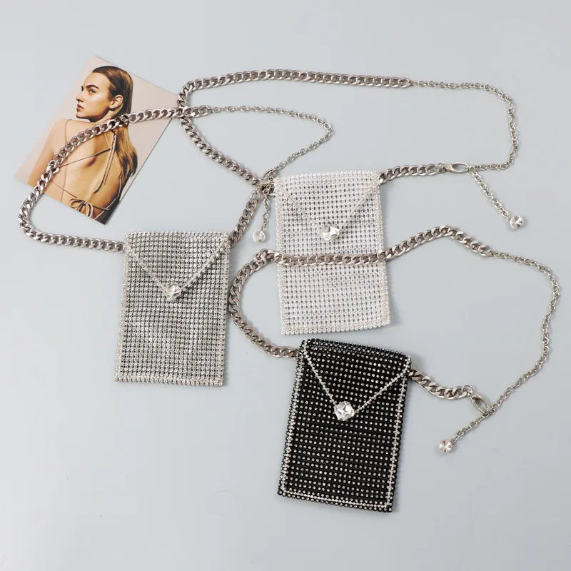 Fashionable women metal waist chain with a crossbody bag that can hold a phone and lipstick. The silver full rhinestone design adds sparkle and style to any outfit.