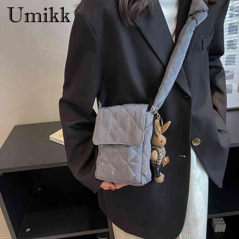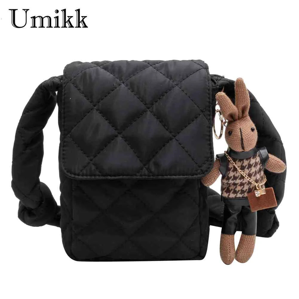Rhombic Lattice Crossbody Bag with Rabbit Toy, Casual Cotton Soft Bag