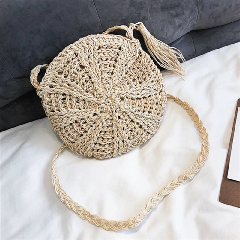Round Women Paper Rope Shoulder Bag Tassel Summer Beach Crossbody