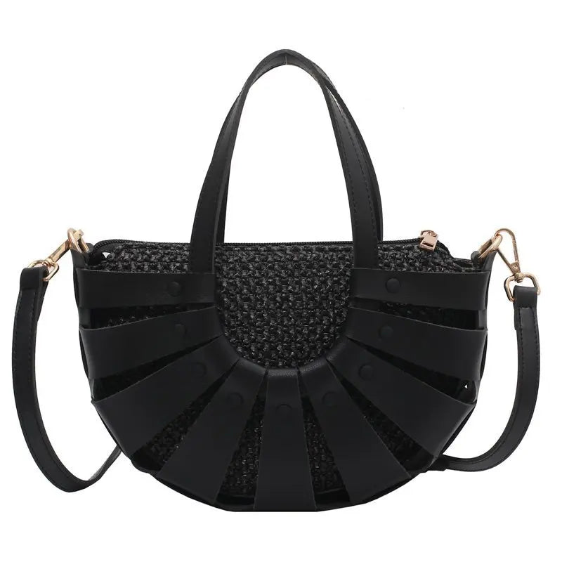 This stylish straw shoulder bag features a semicircle design with intricate stitching, perfect for casual outings or beach days.