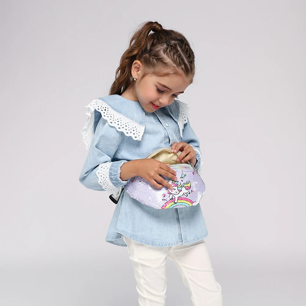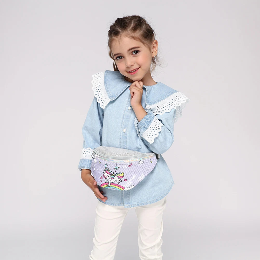 This stylish waist bag is perfect for women, girls, and kids. It features a sequins printing design with glitter, ideal for carrying phones and other small essentials.