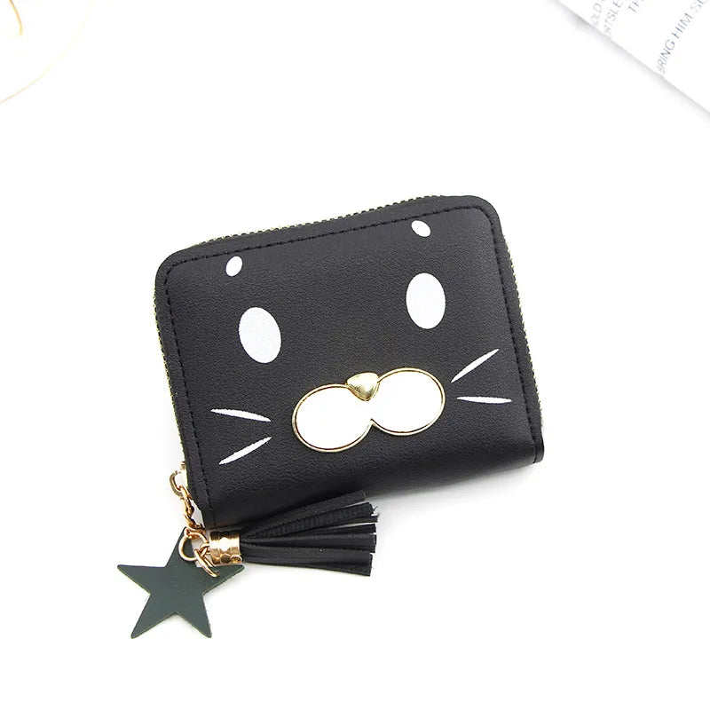 This stylish short women's wallet features a tassel design with a secure hasp closure. It has multiple compartments for cards and a coin purse.