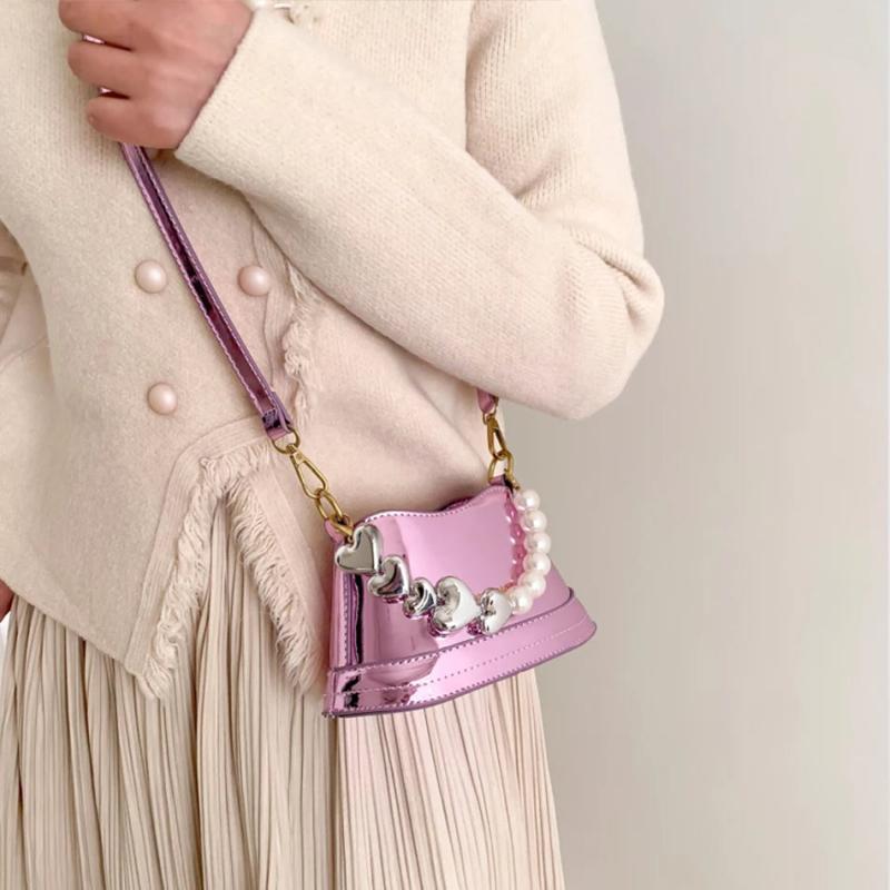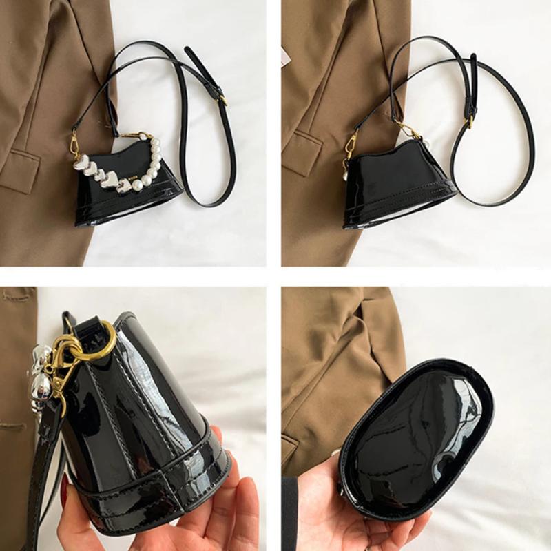 Silver Beaded Shoulder Bag for Women Mini Patent Leather Makeup Hanbag