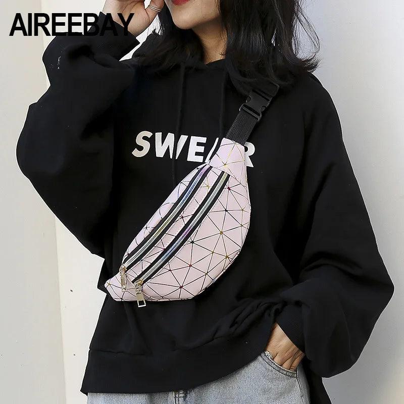Stay trendy with this holographic waist bag featuring a geometric design. Perfect for carrying your essentials in style.