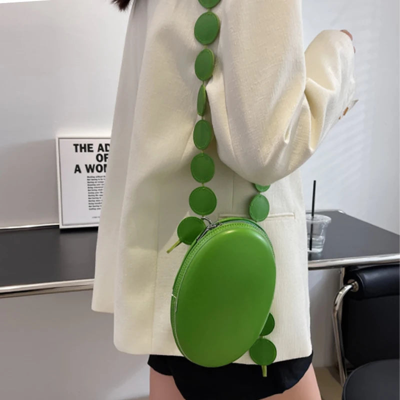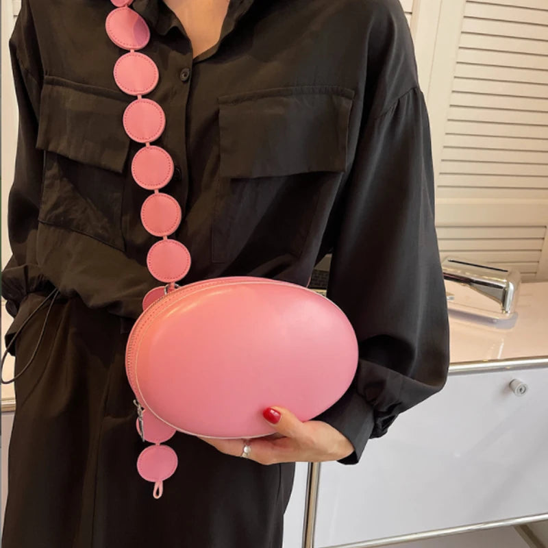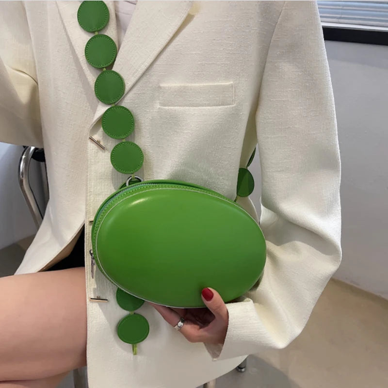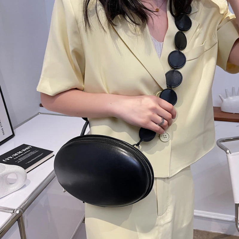 This stylish small oval crossbody bag is perfect for carrying your essentials. It features a single shoulder strap and a convenient messenger bag design.