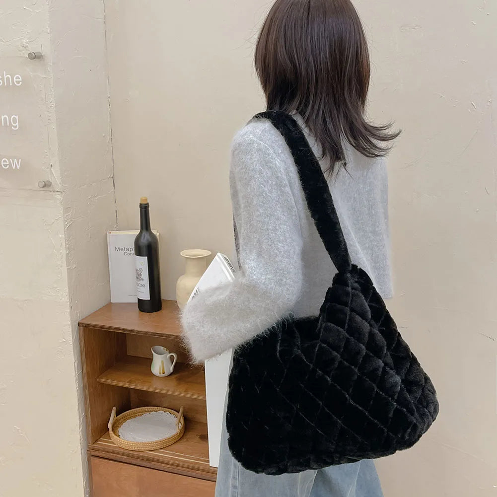 Soft Plush Casual Hand Bags Women Fluffy Solid Rhombus Pattern Lady Daily Satche
