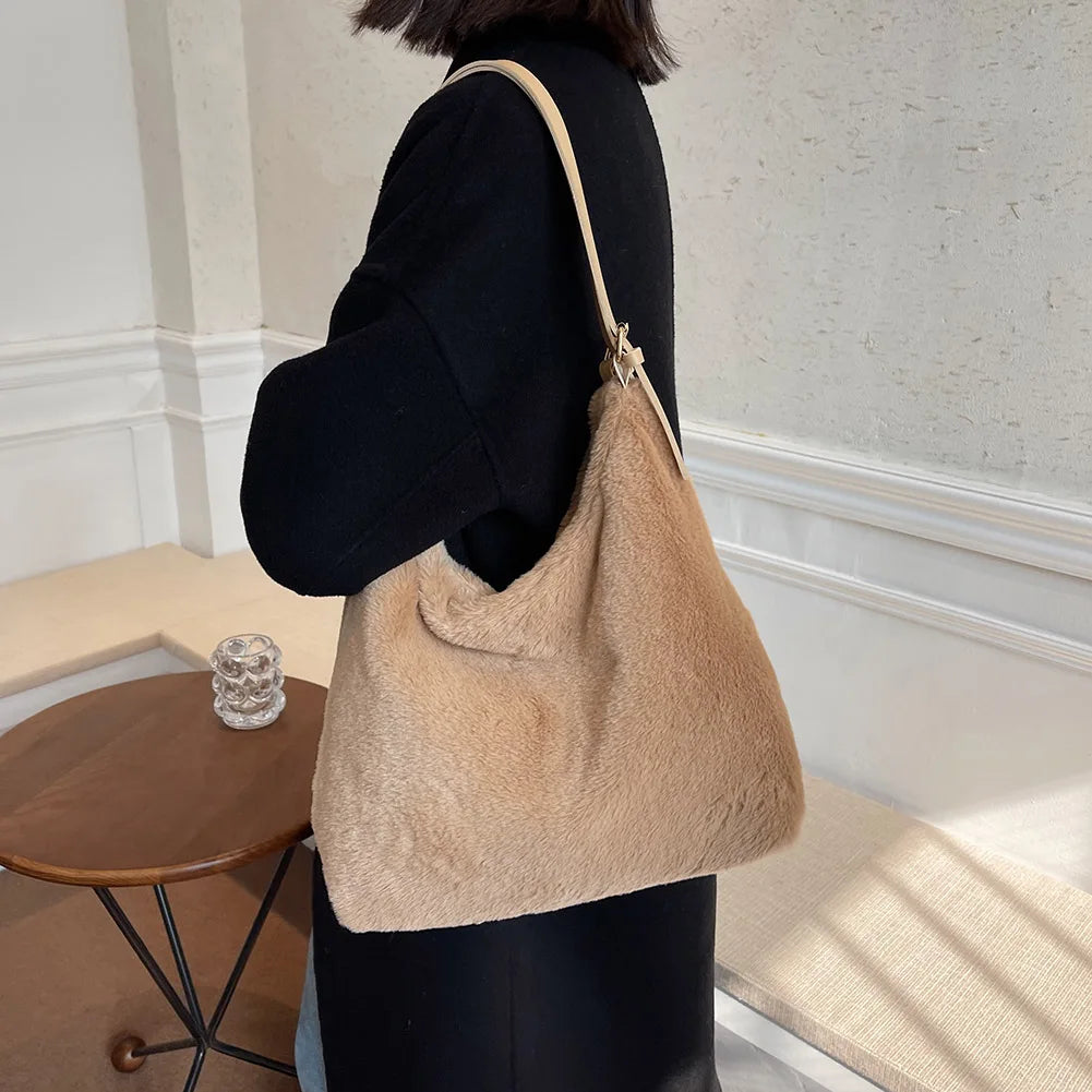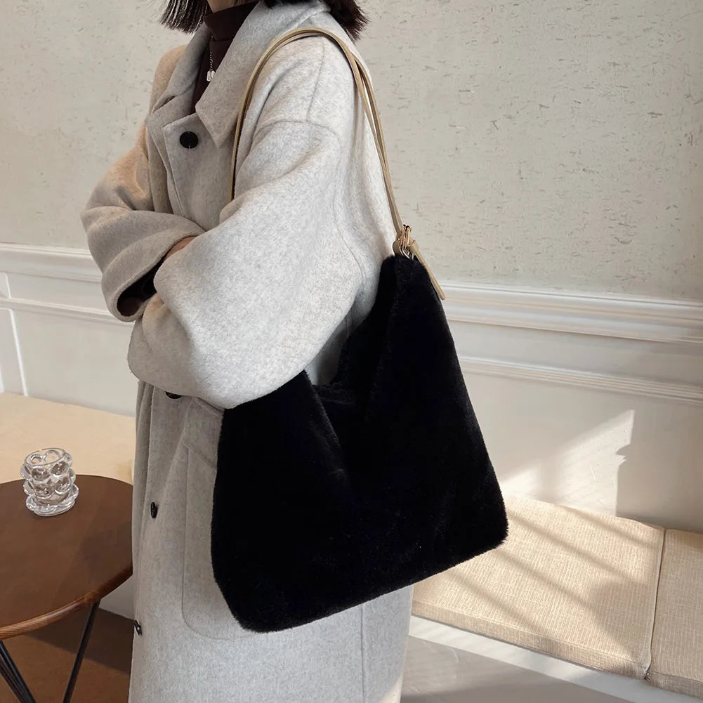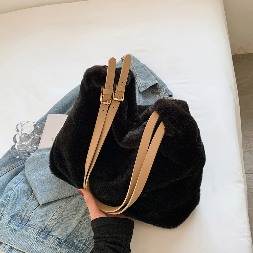 Soft Plush Double Strap Shoulder Bag Winter Warm Faux Fur Shopping Bag