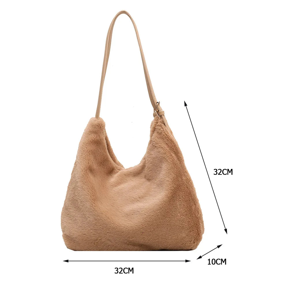 Stay cozy and stylish with this plush faux fur shoulder bag. Large capacity tote perfect for winter shopping outings. Features double straps for added comfort.