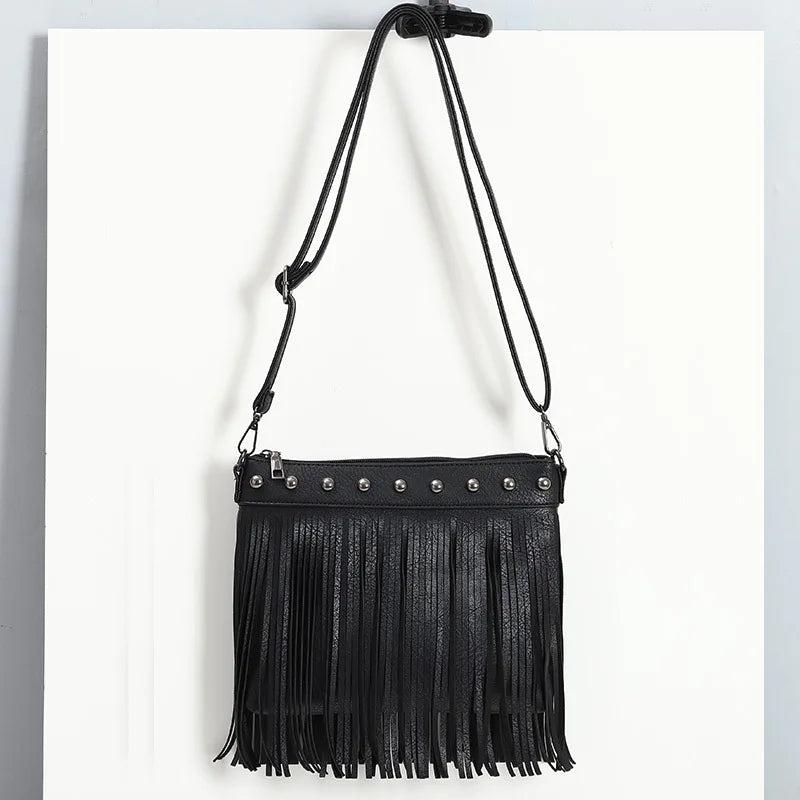 This stylish shoulder bag is made of soft PU leather and features rivet and tassel details. Perfect for everyday use or a night out.