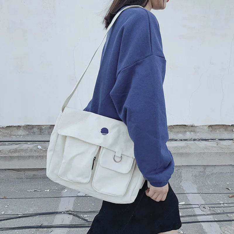 This stylish shoulder messenger bag is perfect for teenagers and women. It features a space-themed canvas design that is great for school or casual outings.