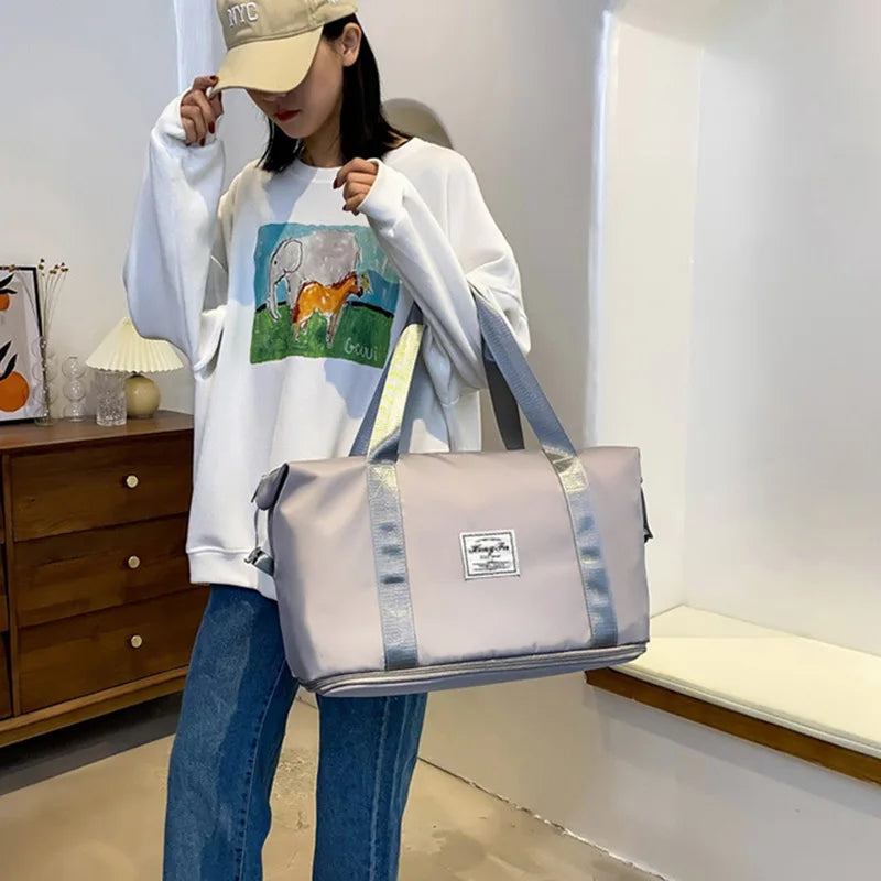 Stay organized with this versatile tote that features wet and dry separation compartments. The bag is designed for gym, yoga, and travel purposes. It's foldable and expandable for your convenience.