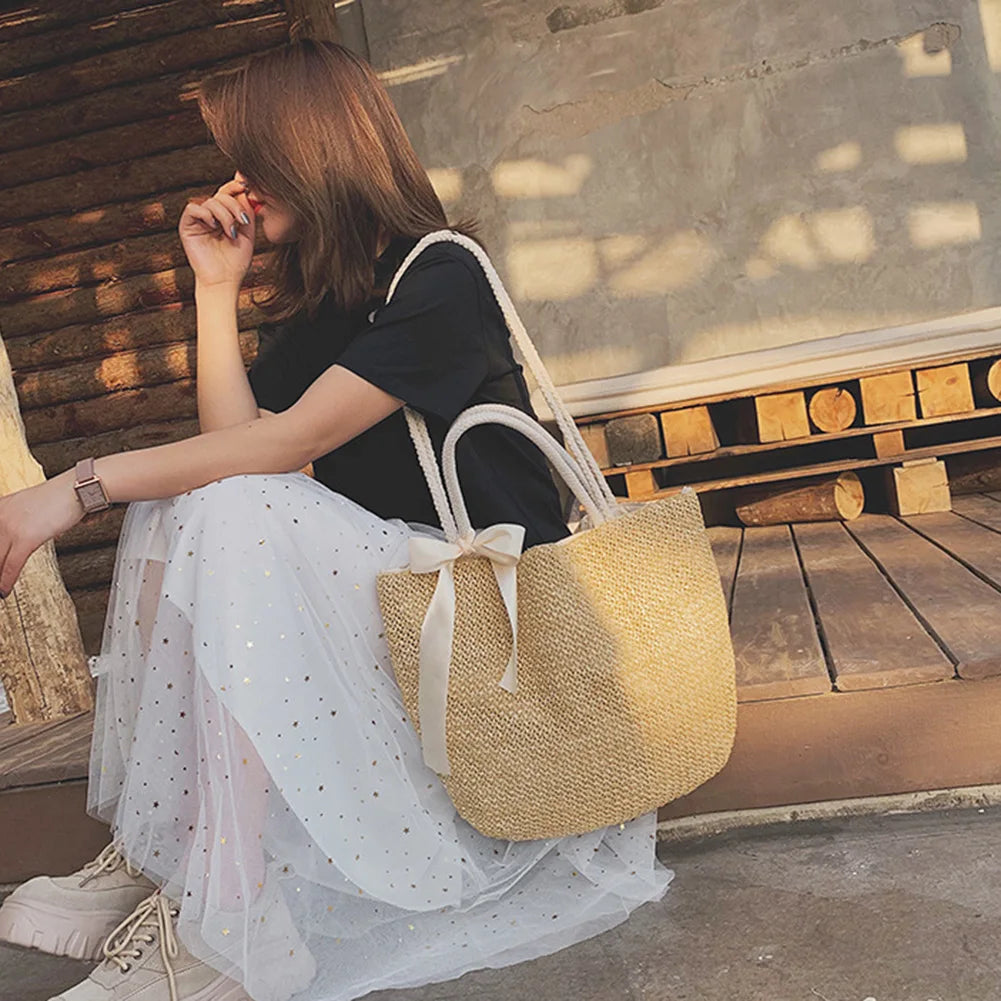 Straw Shoulder Bag with Bow Large Capacity Rattan Top-handle Bag