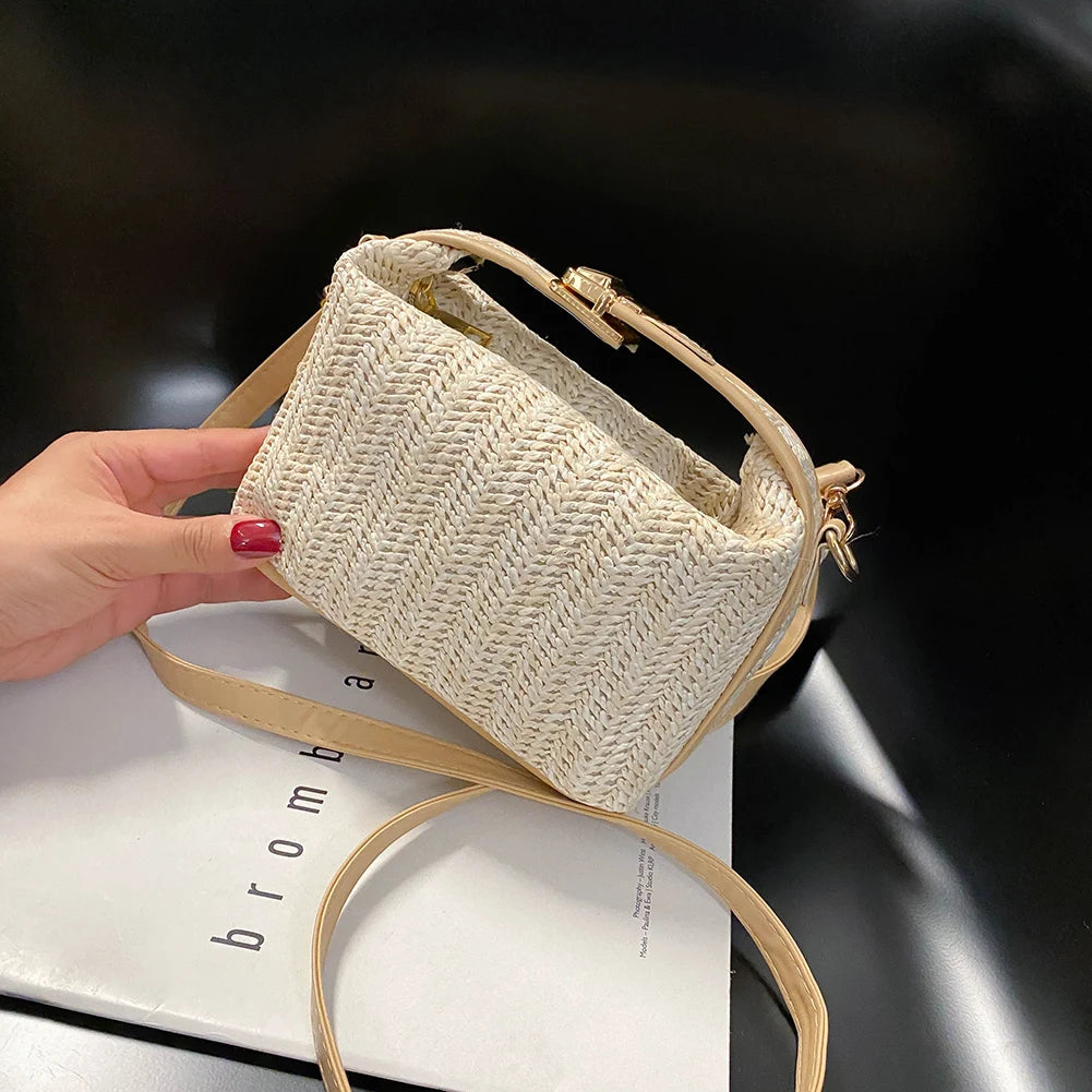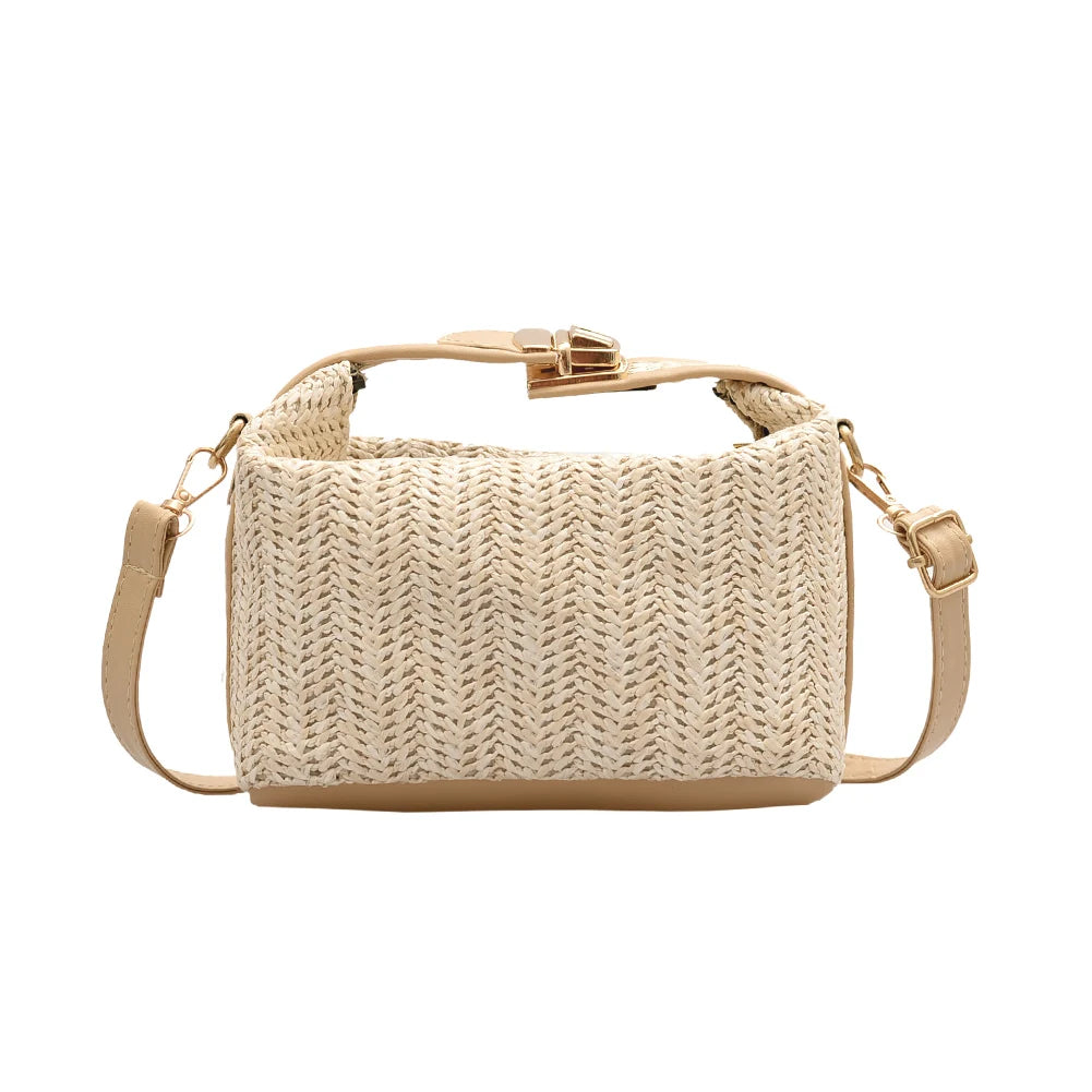 Straw Women Shoulder Bag PU Splicing Casual Messenger Pouch