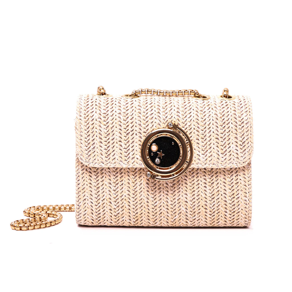 This hand-woven straw bag is perfect for a relaxed holiday look with a touch of literary charm. Ideal for carrying your essentials while on the go.