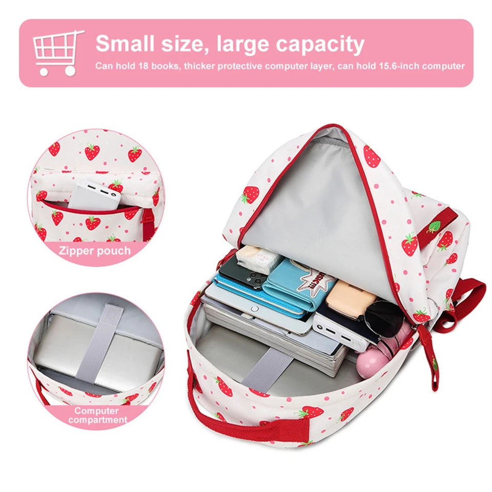 This stylish backpack is perfect for middle school girls, featuring a cute strawberry print design. It's ideal for school use or casual outings.