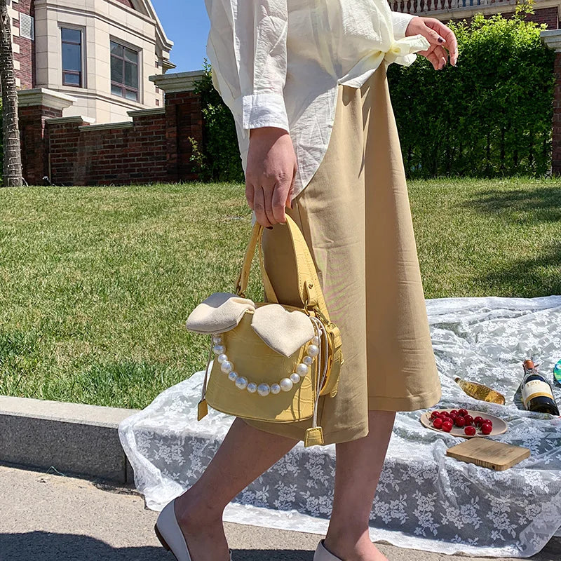 This high-quality bucket bag is made of PU leather and features a drawstring closure. Perfect for summer outings.