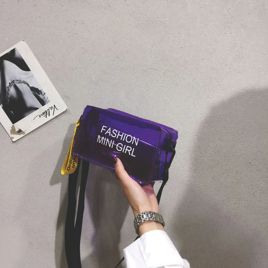 This women's jelly bag is perfect for summer with its transparent design. It features a square shape and can be worn as a sling or shoulder bag.