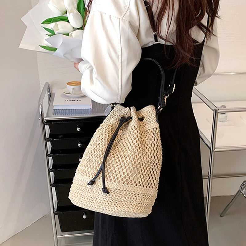 Summer Straw Bucket Bag Drawstring Crossbody Travel Beach Purse