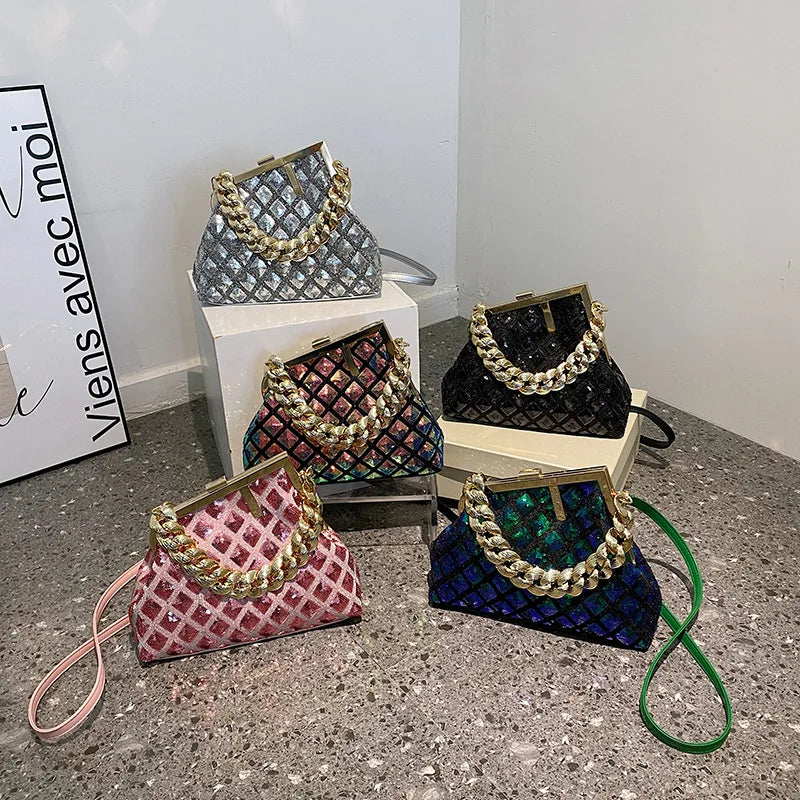 Elevate your style with this fashionable bag featuring a thick chain handle. Made of high-quality materials, this versatile bag can be used as a clutch, purse, or crossbody bag.