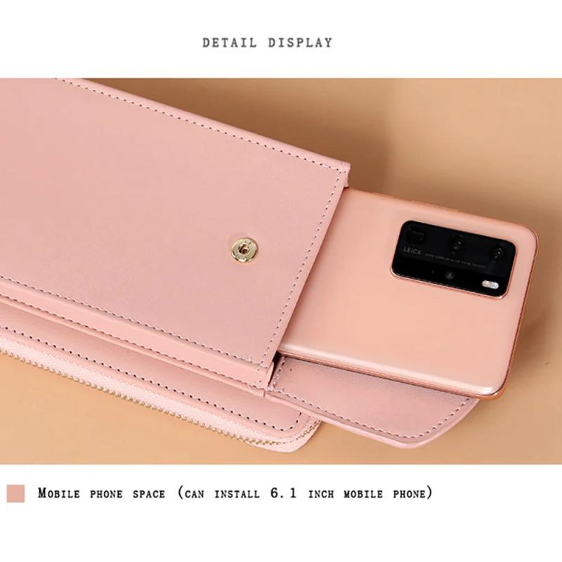 This universal mobile phone bag is compatible with Samsung, iPhone, Huawei, HTC, and LG. It features a shoulder strap for convenience and a stylish letter print design.
