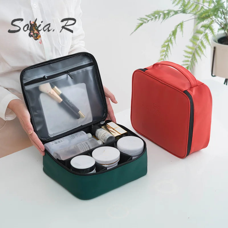 This waterproof travel bag is made of durable canvas material, designed for men and women to conveniently carry their makeup essentials. It has a large capacity for storing various items.