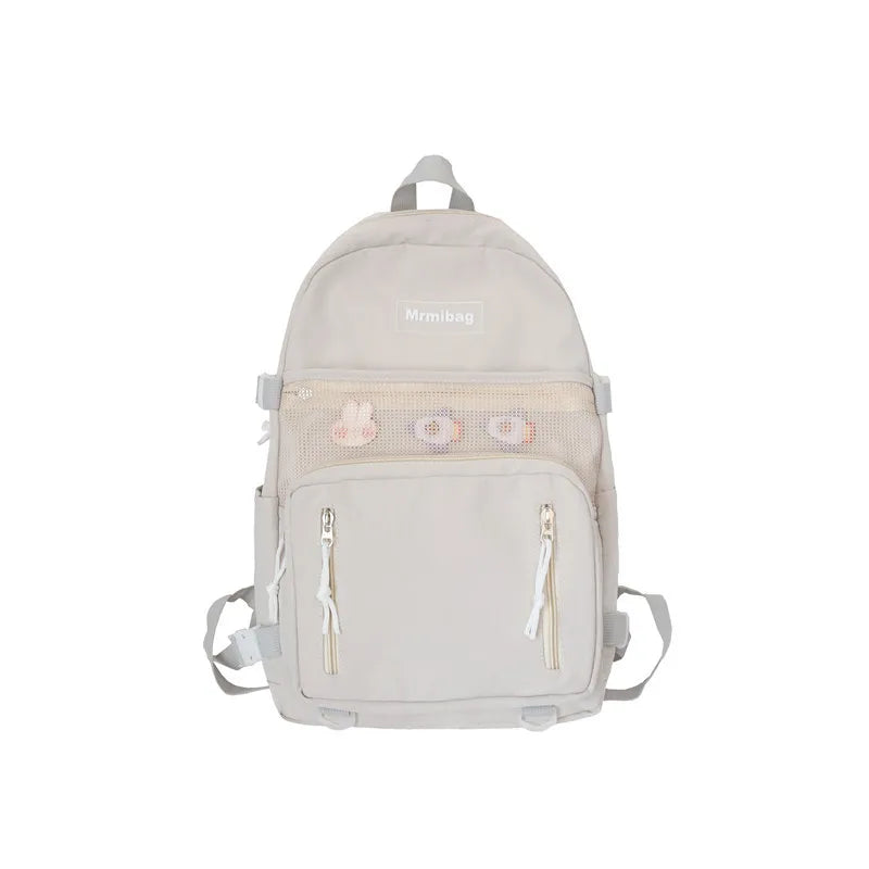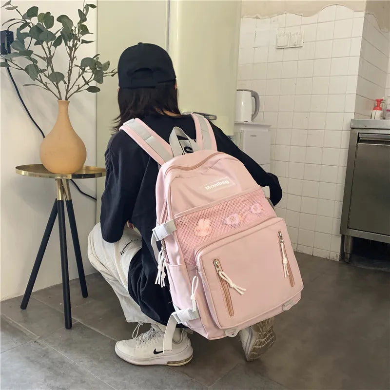 Stay stylish and organized with this girly backpack made of waterproof nylon. Perfect for school or college, featuring a net bag design.
